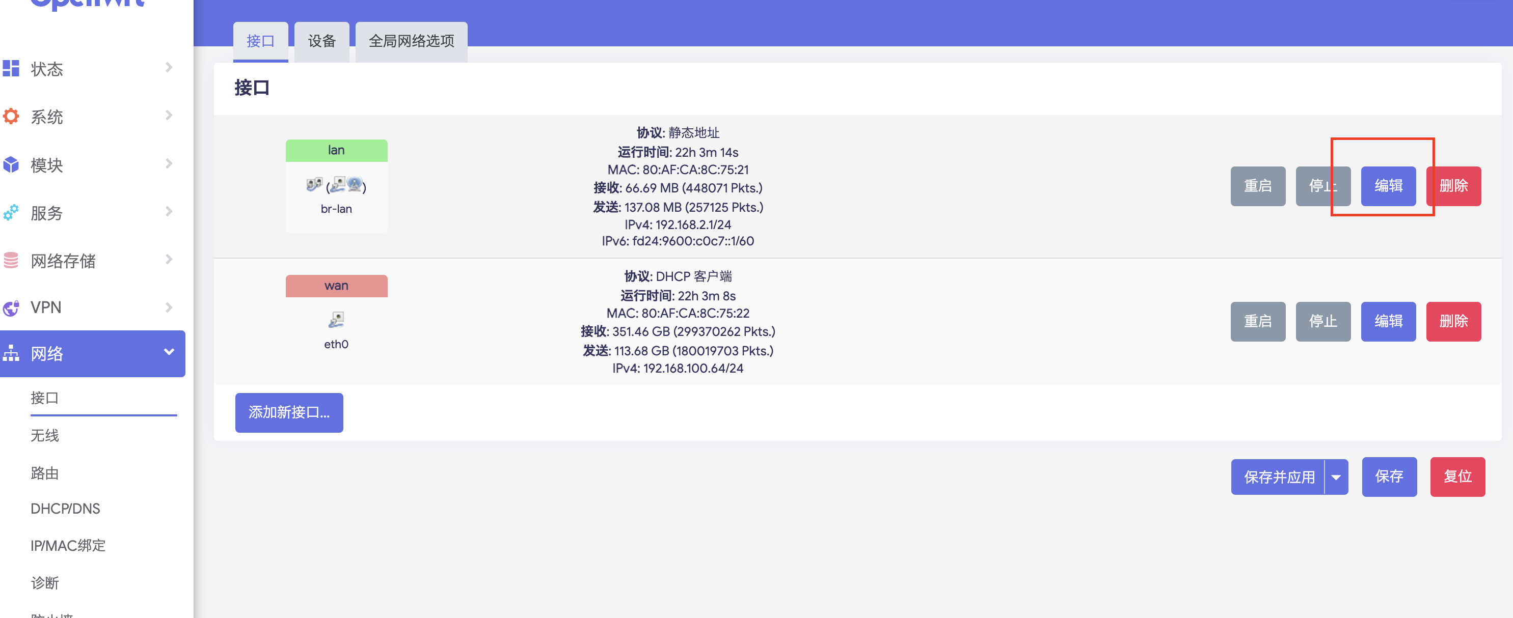 网络 -》 接口 -》Lan口 设置: