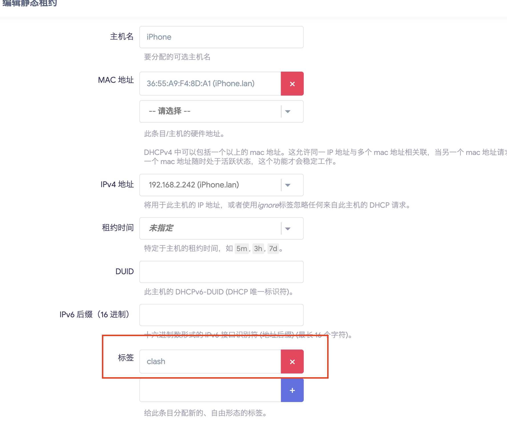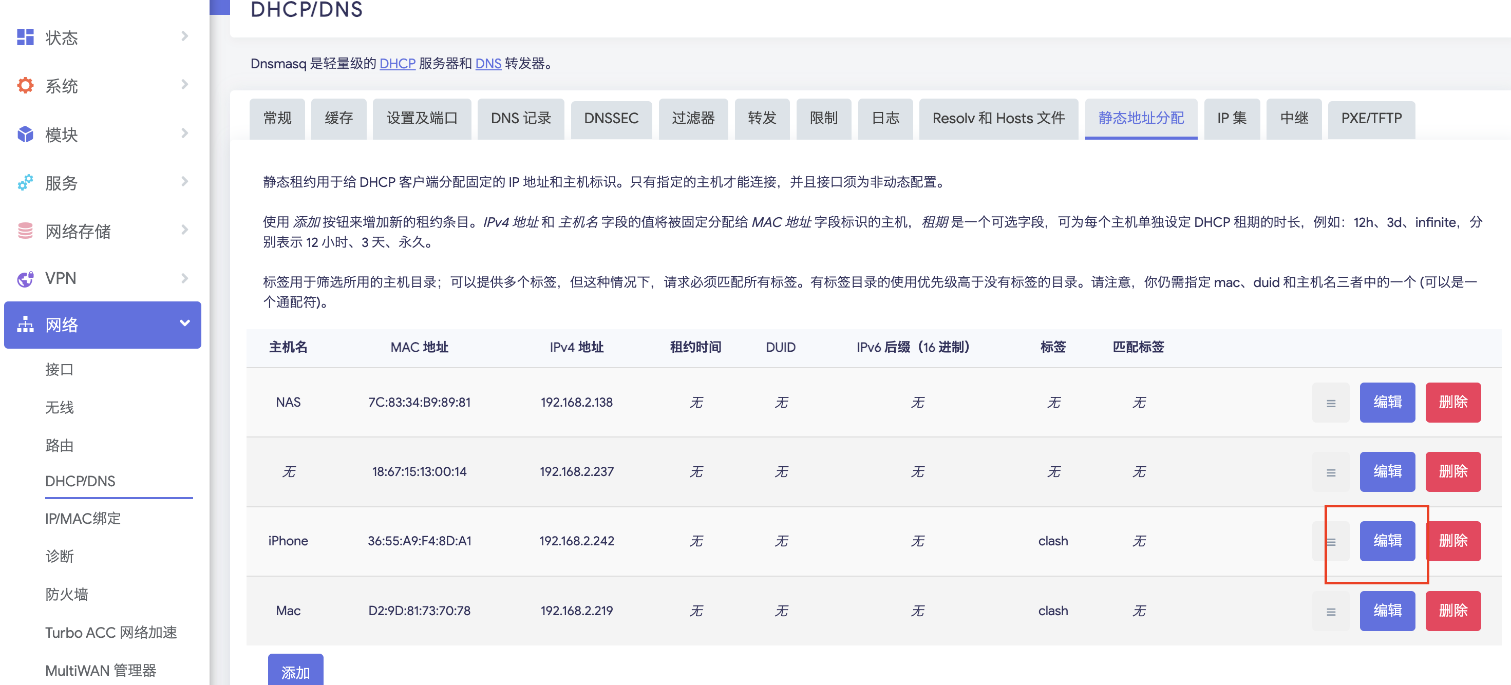全局设置对接入网络的所有设备都将生效,如果想让部分设备配置不同的网关和路由,可以通过给设备打标签实现。先将设备DHCP租约设为静态,再去静态地址分配进行打标