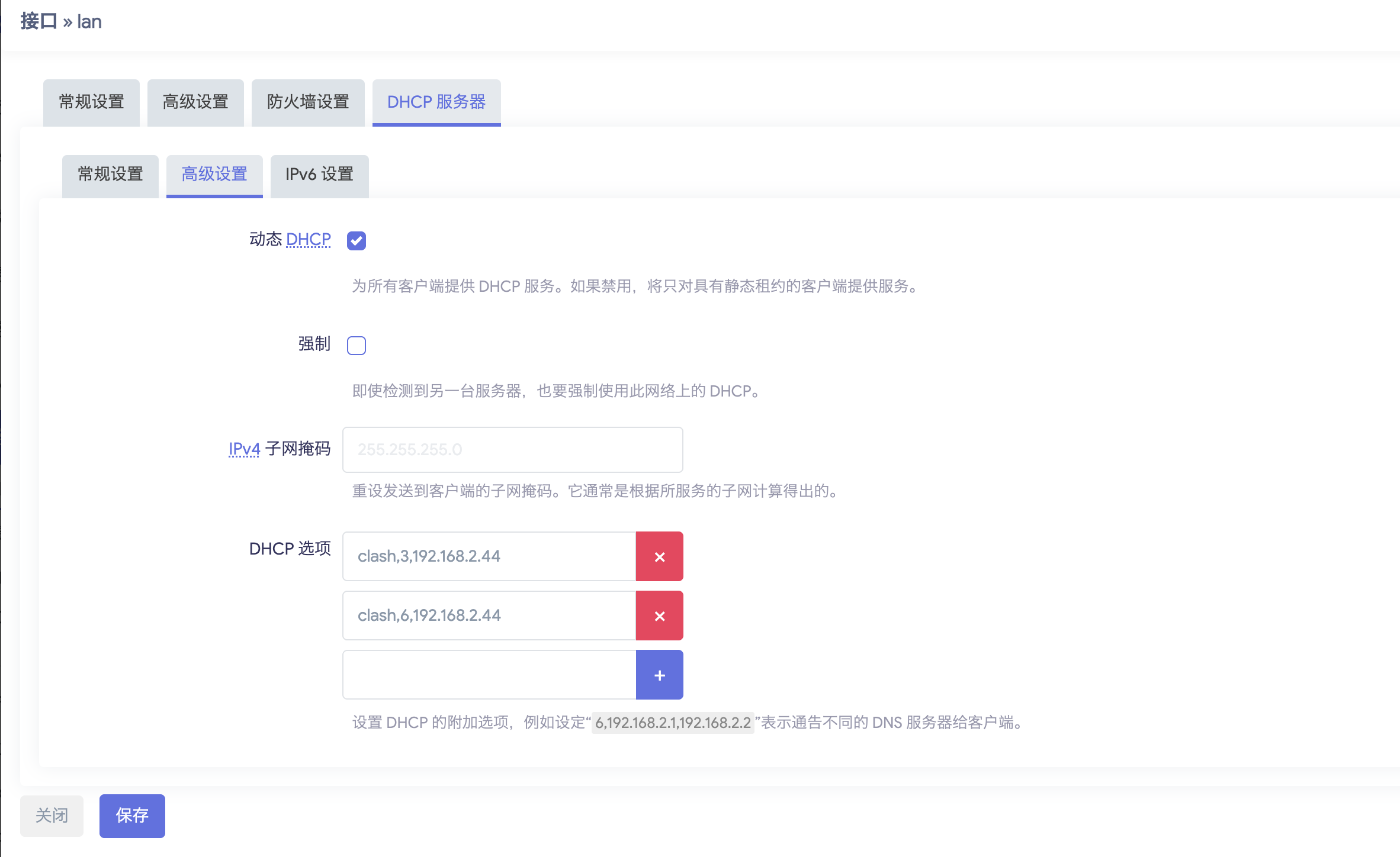 即将clash标签添加到DNS和网关信息前,注意使用半角逗号,作为间隔,这样设置有打过标签clash的设备接入网络时默认的DNS和网关都是192.168.2.44,未打标的设备还使用默认DNS和网关。